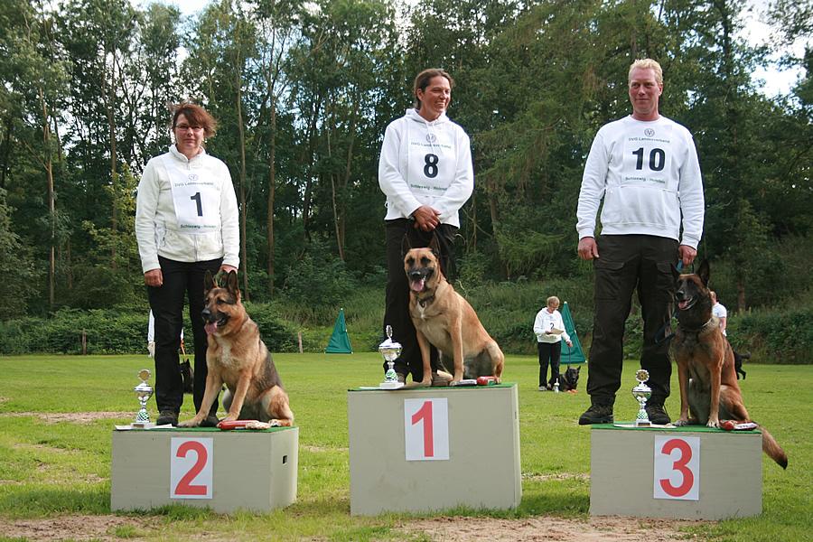 Das Losglück der 1. Fährte für Schleswig-Holstein fiel auf Marlene, die mit Ihrer Fenja leider nicht den erhofften Erfolg erzielen konnte, da sich Fenja dafür entschieden hatte, mit absoluter Sicherheit in die Verleitung zu gehen. Bis dahin war es eine Toparbeit, die ich als Mannschaftsführer live begleiten durfte. Abbruch mit 61 Punkten. Durch die Verspätung in der Fährtengruppe B konnte ich Bina leider nicht begleiten. Aber sie hat Ihr „Fährtendebüt auf großer Bühne" mit 73 Punkten abgeliefert. Als nächster Starter war Rolf an der Reihe, eine sichere Suche mit kleinen Fehlern brachte dann das Ergebnis von 94 Punkten. Es ist schon ein Erlebnis Hundeführer und Hund bei der Arbeit zu beobachten, denn die Fährten waren riesig. Dieser Eindruck wurde noch durch die unendlichen Weiten der Felder verstärkt. Danach Andreas, der mit seinem Anno, dem Tagessieger der Schleswig-Holsteiner mit 95 Punkten machte. Als letzter Starter unseres Landesverbandes ging Petra mit Josch an den Abgang. Auch hier konnte ich wieder eine Fährtenarbeit vom Feinsten begleiten, 92 Punkkte für die Beiden.